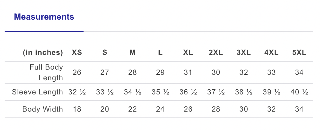 | Size | Full Body Length | Sleeve Length | Body Width |
